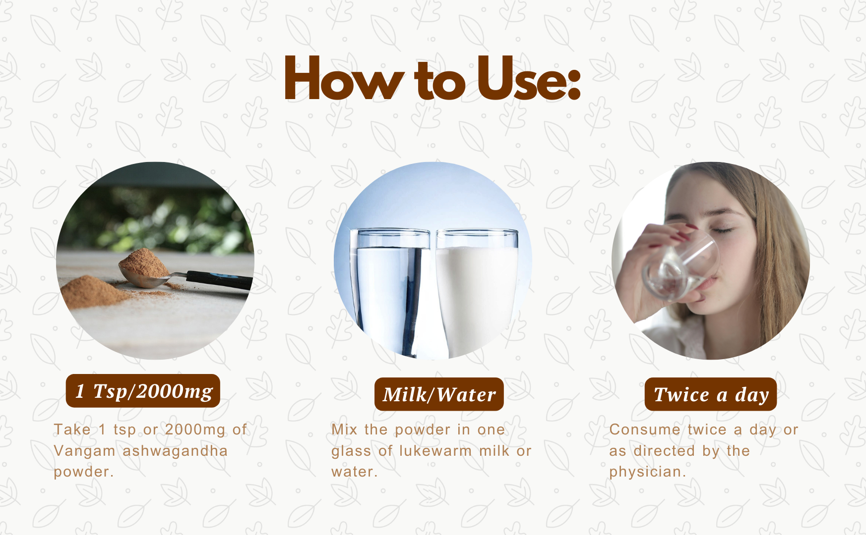 Mix 1-2 teaspoons of Ashwagandha powder with lukewarm milk, water, or a smoothie.