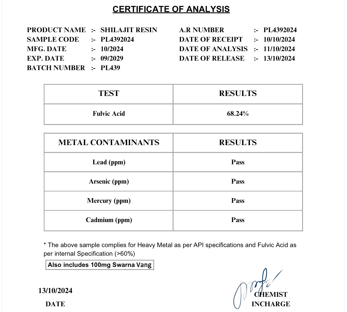 Shuddh Shilajit (Asphaltum Punjabianum): A natural substance from the Himalayas, rich in Fulvic Acid (68.24% confirmed by lab results) and over 84 minerals, known for boosting energy and rejuvenation.