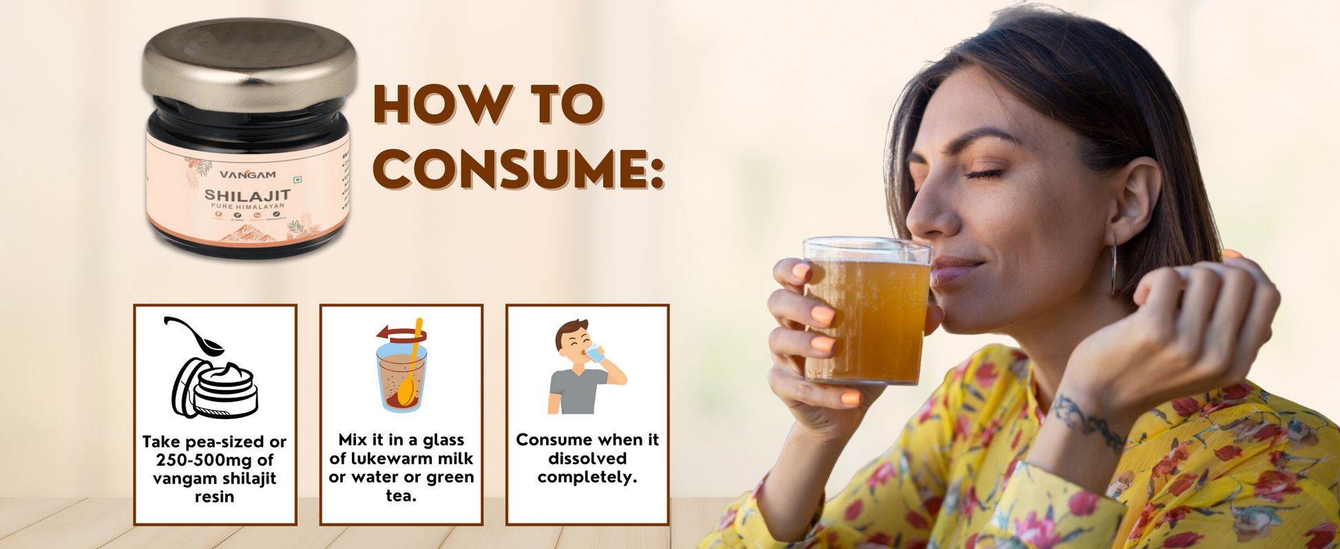Take a pea-sized amount (250-500mg) of Vangam Shilajit resin. Dissolve it completely in a glass of lukewarm milk or green tea, and consume twice daily, or as directed by your physician.